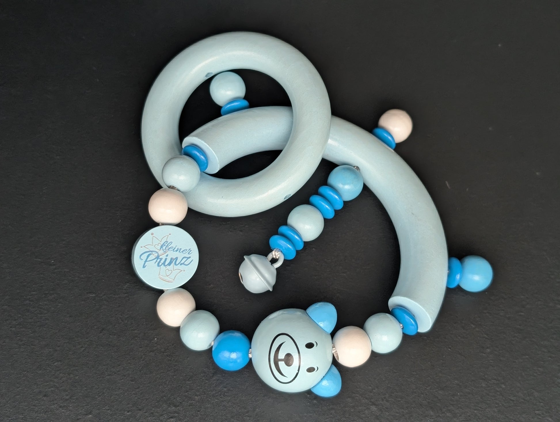 Mit einem fröhlichen Bärchenkopf, einem dezenten „Kleiner Prinz“-Motiv und einer sanft klingelnden Rassel sorgt er für Freude und Sicherheit zugleich.