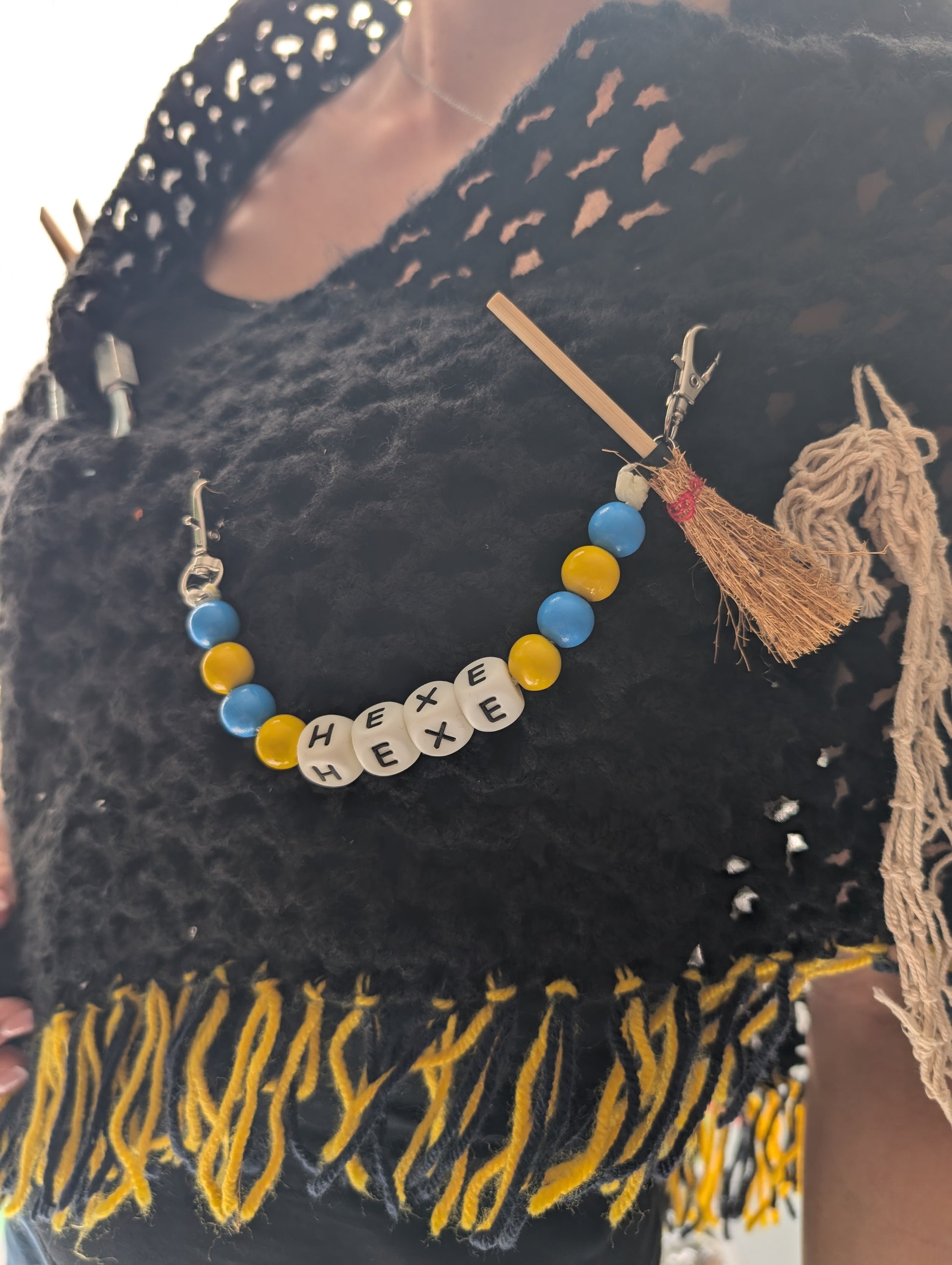 Mit ihren blauen und gelben Holzperlen, den Buchstabenwürfeln mit dem Schriftzug „HEXE“ und dem Mini-Besen-Anhänger verkörpert sie traditionelles Hexen-Handwerk mit einem modernen, farbenfrohen Touch.