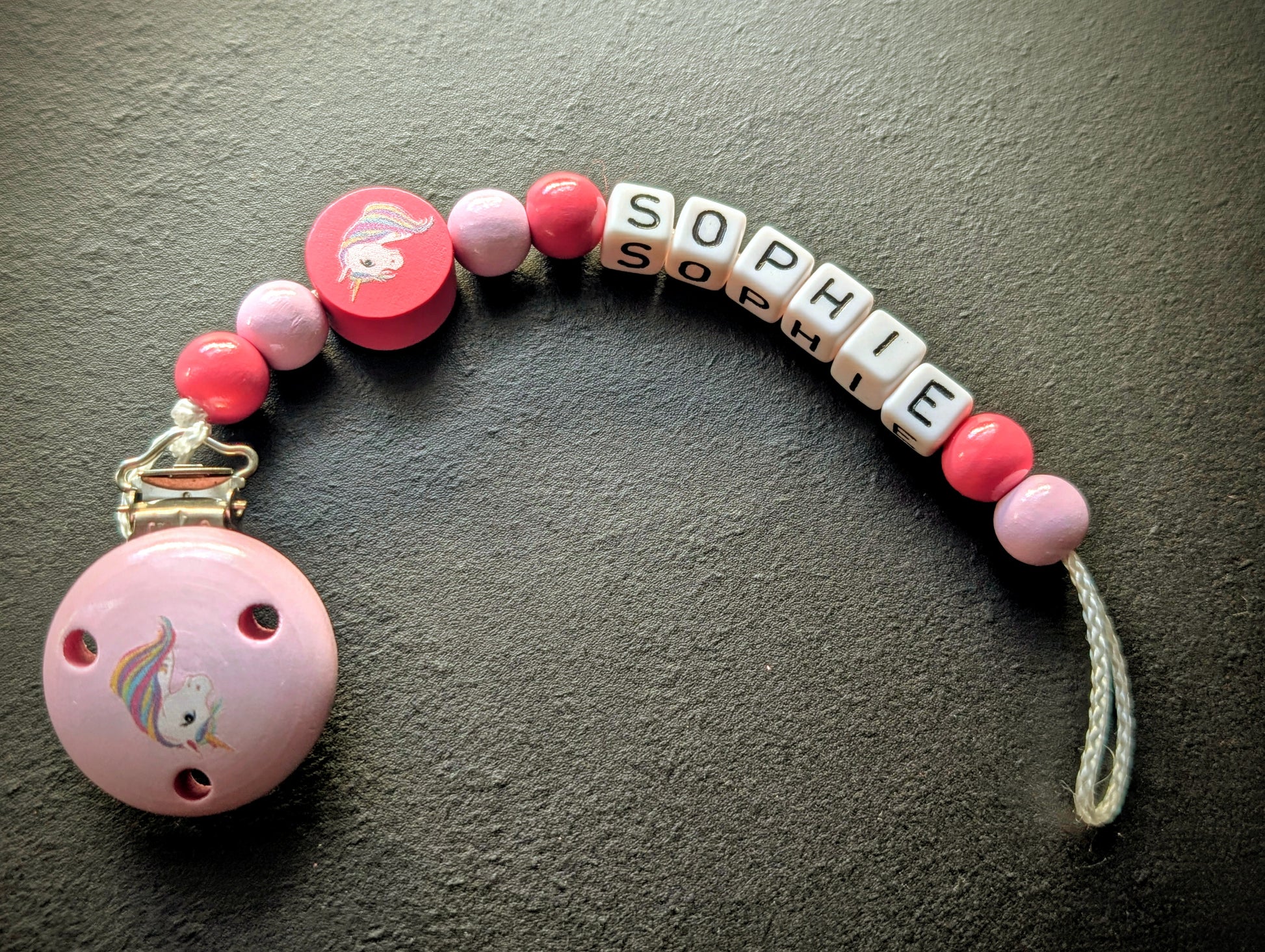 Schnullerkette mit Wunschnamen Rosa Einhorn – Holzperlen Handgemacht Baby Geschenk Mädchen